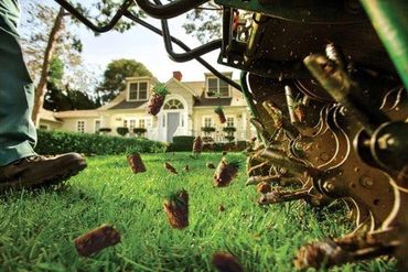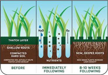 Aeration - 3 to 4" plugs are mechanically pulled from your lawn. In doing so, the small holes poked in your lawn relieve the soil of compaction. This gives your grass an easier path to extend roots outward and downward, in turn making it more resilient to heat and drought, as well as more readily apt to absorb nutrients.